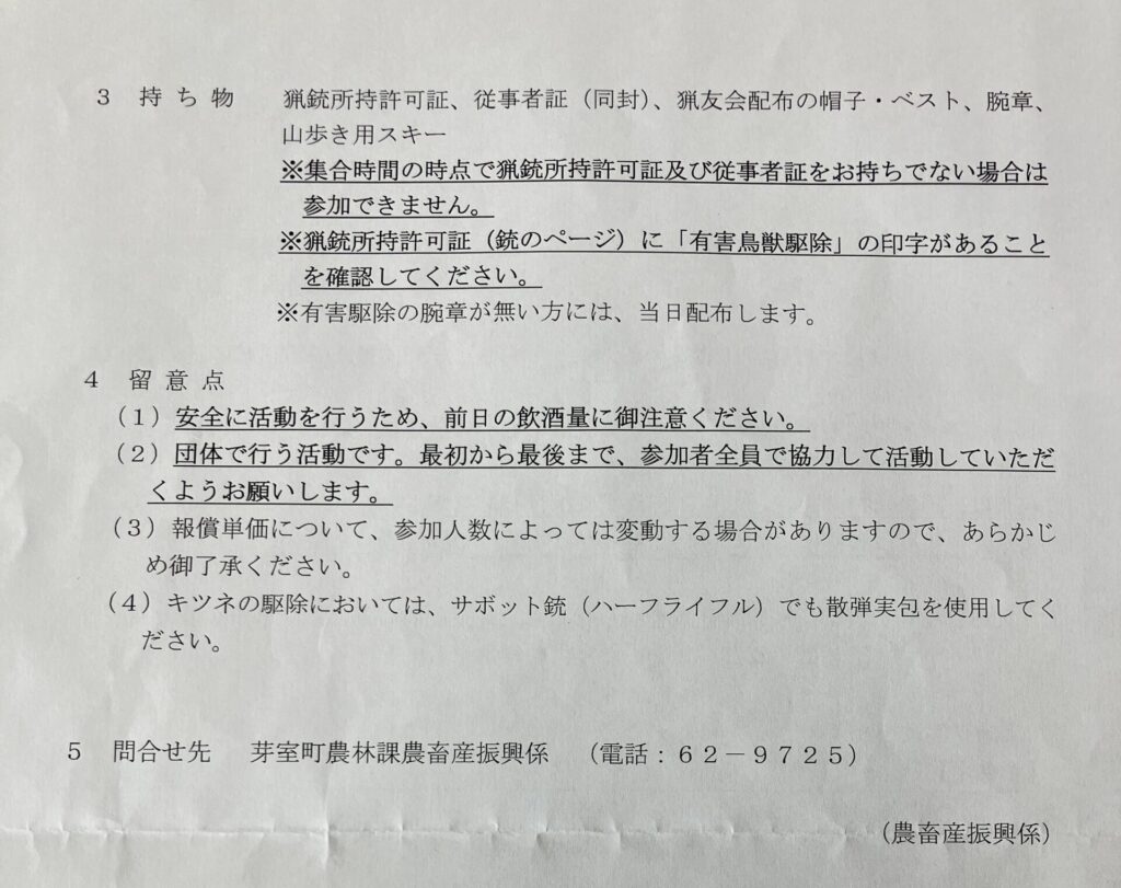 まずは猟友会への手続きをした際に渡された実施要綱にある持ち物を用意して参加することとしました。