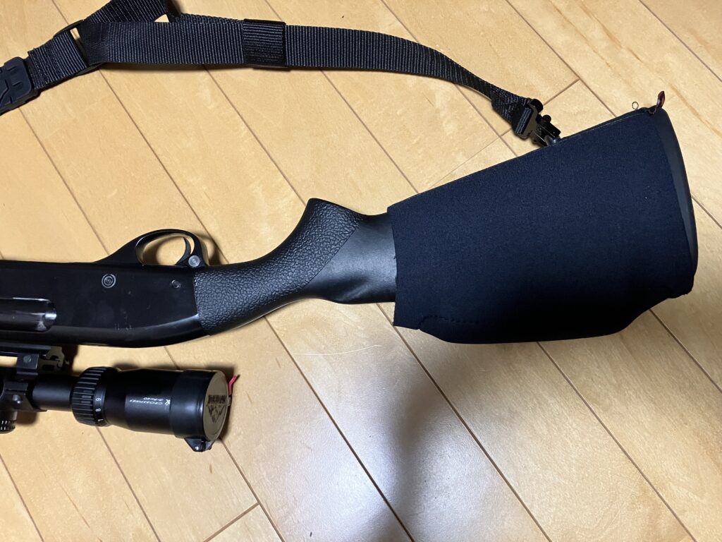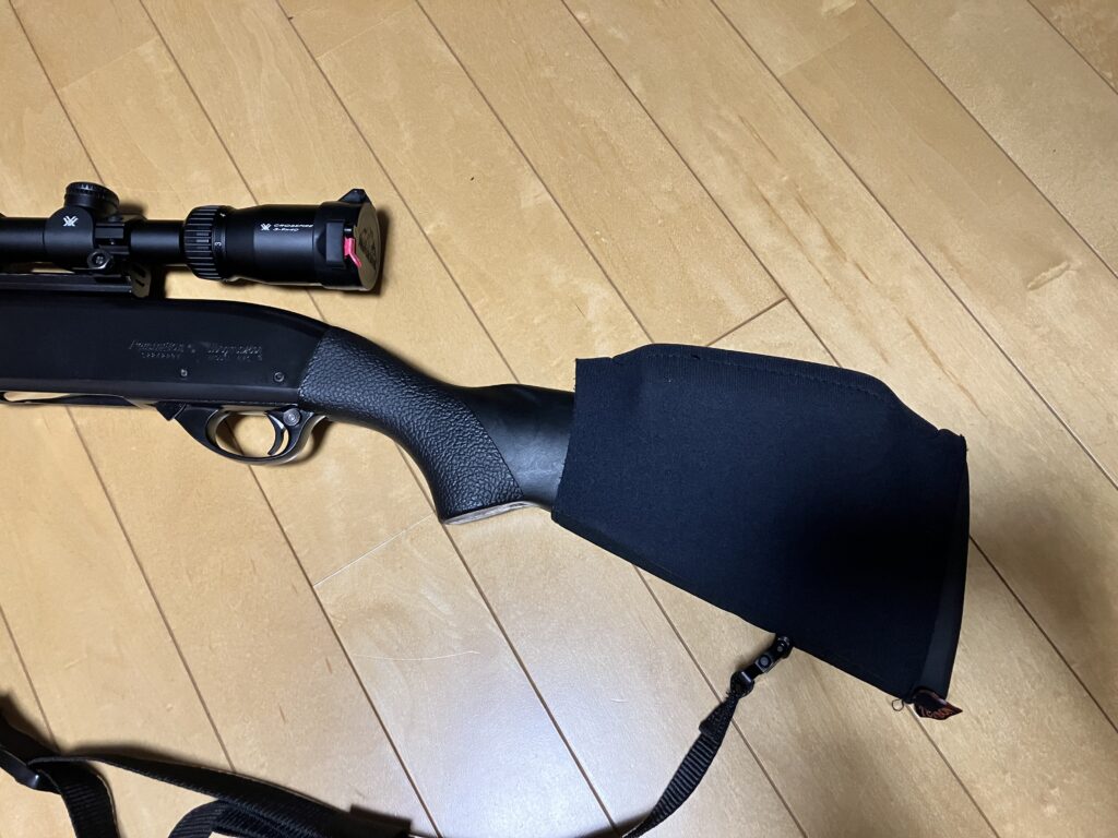 購入時のストックのままではスコープを安定して覗くことができないため、チークパッドを取り付けてスコープを覗く高さを調整してあります。